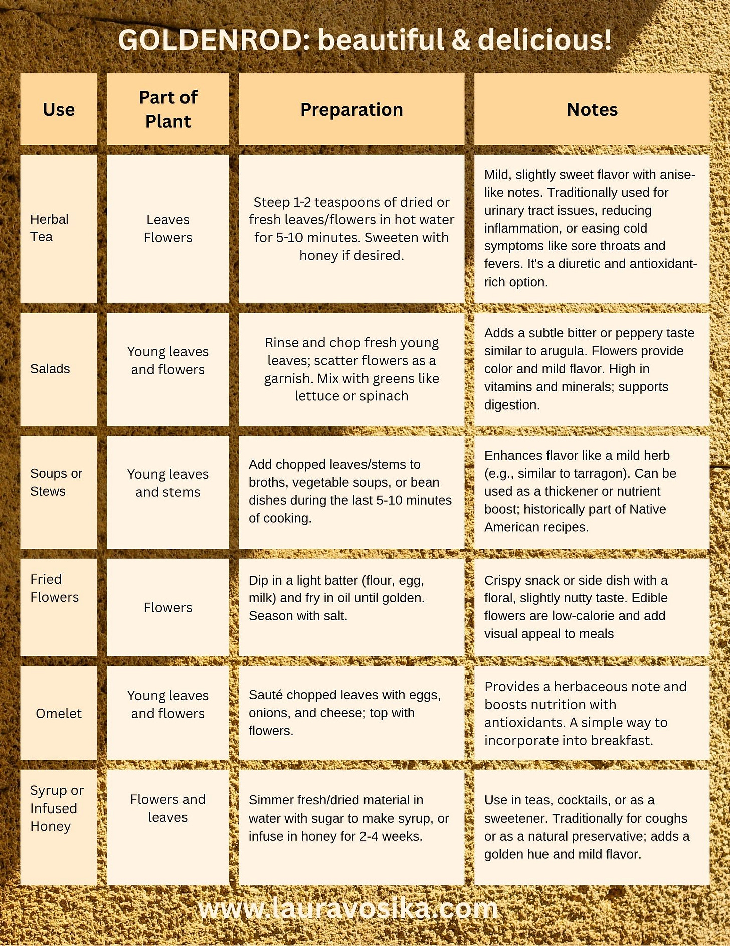 Goldenrod (Solidago spp.) is a versatile wild plant, native to North America and parts of Europe, that has long been foraged for both culinary and medicinal purposes. It’s generally safe for most people when properly identified and used in moderation. It’s part of the Asteraceae family, so, while rare, those with allergies to ragweed, daisies, or similar plants might also be allergic to goldenrod.